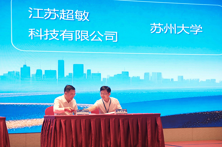 江苏超敏科技有限公司与苏州大学基于双方在放射学交叉领域发展目标上的契合点,以及各自在核技术应用领域的优势和特长达成战略合作,超敏董事长刘飞和苏州大学史海斌共同在战略合作协议上签字。此次合作旨在联合放射医学与辐射防护国家重点实验室,聚焦核科学、核医学、放射防护领域的科技成果转化及科研项目产业化,并设立超敏奖学奖教金,引导高等院校科研力量和创新创业人才向现代化产业体系建设方向集聚发力。